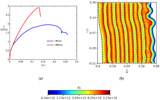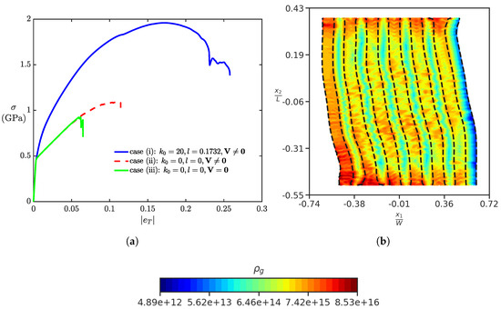 In this section, we investigate the response of NML in three cases. For case (i), we take the usual parameters (), while for case (ii), the parameters are (), and for case (iii), the parameters taken are (). Physically, case (ii) corresponds to just Voce’s law-based hardening (without the effects of GND hardening) and no plastic strain rate due to mesoscopic core energy. For case (iii), in addition to case (ii), there is no plastic straining due to the motion of GNDs, and this case is closest to conventional plasticity within our unified crystal plasticity and dislocation mechanics framework. As expected, with no hardening from GNDs accounted for in case (ii) and case (iii), we obtain a weaker strain-hardening response, as compared to case (i). It was observed in numerical simulations that kink bands do not form for case (ii) and case (iii), as shown in Figure 10b, which shows the GNDs density field plot for case (ii) at true strain.