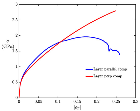 True stress-strain curve when the layer direction is aligned perpendicular or parallel to the compression loading direction.