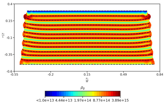 Figure 3 shows the field plot of geometrically necessary dislocation (GND) density () and the norm of logarithmic strain tensor . Here, V is obtained from the polar decomposition of the deformation gradient tensor (), and F is defined with respect to the initial configuration at . GNDs are generated in the domain due to the inhomogeneity in the material response after yielding from the material inhomogeneity of the laminate structure in NMLs, and the imposition of jump condition on plastic strain rate at the interfaces.
