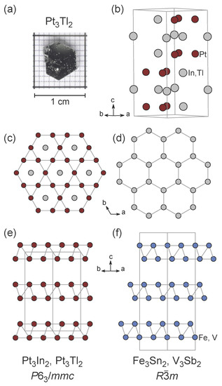 There is, in addition, the Pt3Tl2 structure type, a variant of the Fe3Sn2 structure with the same stacking sequence but a distinct stacking arrangement (Figure 1e,f). This structure is adopted by Pt3Tl2 and Pt3In2. The structures of these compounds were reported more than fifty years ago [30], but no information about their electronic or magnetic properties was found in the literature. Here we examine the behavior of these two compounds using X-ray and neutron diffraction, density functional theory, and electrical transport, magnetization, and heat capacity measurements. We find that the Fermi level resides in a pseudo-gap in the density of states, and this theoretical result is in good agreement with our heat capacity and magnetization data. Multiple bands and carrier types appear to contribute to the conduction based on the calculated electronic structure and measured Hall effect. Due in part to the low density of states, we observe diamagnetic behavior, and we see no signature of phase transitions of any kind between room temperature and 2 K. The anisotropic magnetoresistance in Pt3Tl2 at 2 K, longitudinal and transverse, shows no sign of saturation up to 13.5 T and reaches values exceeding 200%. The longitudinal magnetoresistance shows quantum oscillations (Shubnikov–de Haas oscillations), which are also seen in isothermal magnetization data (de Haas–van Alphen oscillations), indicating reasonably high mobility carriers in the materials.