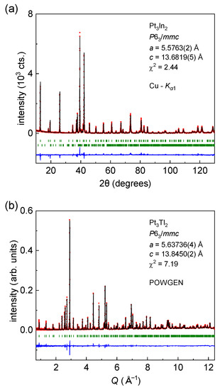 To obtain reliable structural information and investigate the possibility of site disorder in PtX, Rietveld refinement of powder diffraction data was performed. Since Pt and In have significantly different atomic numbers, X-ray diffraction is suitable for this. Pt and Tl, however, have little X-ray scattering contrast, so neutron powder diffraction was used for this compound. The results are shown in Figure 2, and structural parameters and agreement indices are summarized in Table 1.