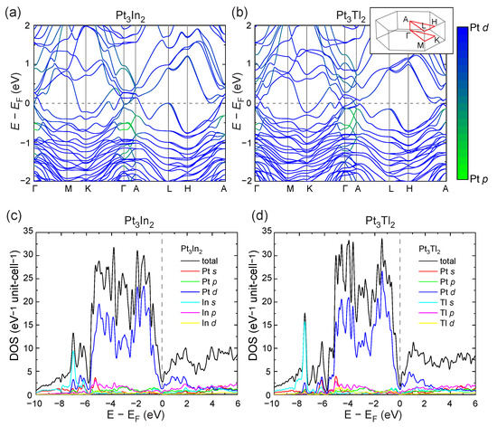 The calculated electronic structures of Pt3In2 and Pt3Tl2 are shown in Figure 3. As expected, states within a few eV of the Fermi level are dominated by Pt- orbitals, especially the valence bands. In both compounds, multiple bands cross the Fermi level, with several hole-like pockets along the k-path traced in Figure 3a,b, and an electron-like pocket near the K point. The Fermi levels lie at pseudogaps in the densities of states (DOS). At , the total DOS per unit cell (12 Pt atoms, 8 In, or Tl atoms) is calculated to be 2.8 eV for Pt3In2 and 1.8 eV for Pt3Tl2.