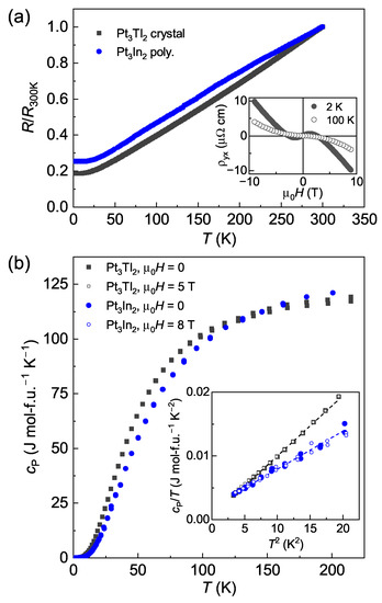 Results of electrical resistivity measurements are shown in Figure 4a. The data are plotted relative to values at 300 K. The Pt3In2 sample was a piece cut from a polycrystalline pellet that had been pressed and sintered as described in the Materials and Methods section. The sample was small and not ideally shaped for accurately determining the cross-sectional area for the current flow. This, along with the polycrystalline nature of the sample, make any precise value of the resistivity unreliable, but measurements near room temperature suggest the powder-averaged resistivity of Pt3In2, is in the cm range. A Pt3Tl2 crystal was used for the measurements, and the current was applied in the ab-plane. The value measured at 300 K was cm. Both compounds behave like metals with resistivity increasing approximately linearly with a temperature above about 50 K. The residual resistivity ratio defined as R(300 K)/R(2 K) is about 4 for Pt3In2 and about 5 for Pt3Tl2.