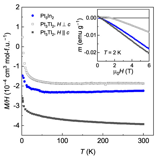 Results of magnetization measurements on PtX. Magnetic susceptibility () was measured upon cooling in an applied field of = 2 T for a powder sample of Pt3In2 and 1 T for single crystals of Pt3Tl2. Isothermal magnetization curves are shown in the inset.