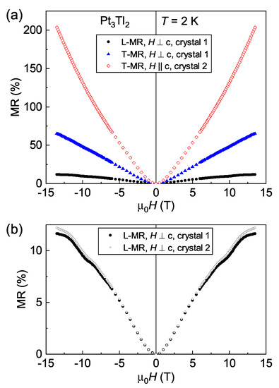 Since single crystals of Pt3Tl2 were available, anistropic magnetoresistance measurements were performed at 2 K and fields up to ±13.5 T. For these measurements, the current I was always applied in the plane of the platelike crystals (). The field was applied in three directions relative to the current and the crystal. The longitudinal magnetoresistance (L-MR) was measured by applying the field parallel to the current (). The transverse magnetoresistance (T-MR) was measured by applying the field perpendicular to the current (), with the field directed either out of the plane () or in the plane (). The measurements were performed at 2 K and the results are summarized in Figure 6.