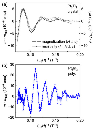 A quadratic background was fit to the L-MR data from 4 to 13.5 T and then subtracted to reveal the oscillatory nature. This is shown in Figure 7a, where the background subtracted data is plotted as a function of the inverse magnetic field. The same physics that produces the Shubnikov–de Haas effect in transport data is expected to produce the de Haas–van Alphen effect in magnetization [44]. Therefore, the isothermal magnetization curve measured at 2 K with was similarly examined. The resulting field dependence is plotted in Figure 7a, and it matches well the oscillations in resistivity. Three local maxima can be seen in the resistance data, at 0.086, 0.122, and about 0.16 T. From this, an approximate frequency of 27 T can be estimated. The magnetization of Pt3In2 at 2 K was also examined to see if quantum oscillations could be observed. The results are shown in Figure 7b. Oscillations are indeed seen, with a period of 0.020 T or frequency of 50 T.