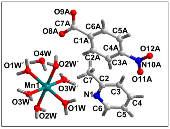 The molecular structure of compound 1 has been depicted in Figure 1. Table 2 represents the bond lengths and bond angles around the Mn(II) center. Compound 1 crystallizes in the triclinic Pspace group. The Mn(II) center is found to be present in a crystallographic center of inversion. The Mn(II) center has an octahedral geometry having six coordinated water molecules (O1W, O1W′, O2W, O2W′, O3W and O3W′). Moreover, two uncoordinated 2-Mepy, two uncoordinated 4-NO2bz and two uncoordinated water molecules are also present. The equatorial sites around the Mn(II) center are occupied by four oxygen atoms (O1W, O1W′, O2W, O2W′) from four coordinated water molecules, whereas the axial positions are filled by O3W and O3W′ water molecules. The Mn–Oaxial bond lengths (2.178 Å) are slightly higher than that of Mn–Oequitorial bond lengths (2.156 Å). The average Mn–O bond lengths are well consistent with those reported for Mn(II) compounds [].