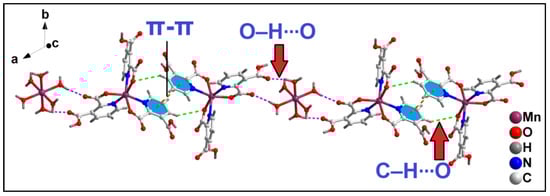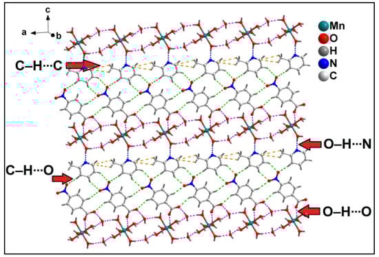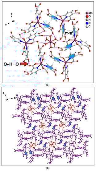 Further analysis unfolds the enclathration of the cationic complex moiety viz. [Mn(H2O)6]2+ within a supramolecular hexameric cavity built by the [Mn(2,3-PDCH)3]− moieties (Figure 6a). The supramolecular hexameric cavity is formed by O–H∙∙∙O and aromatic π-stacking interactions. An uncoordinated O4 atom of 2,3-PDCH is involved in the O–H∙∙∙O interaction with an O2–H2∙∙∙O4 distance of 1.64 Å. π-stacking interaction between the aromatic rings of 2,3-PDCH is observed having a centroid(N1, C2–C6)–centroid(N1, C2–C6) distance of 3.832 Å. These enclathrated guest cationic complex moieties stabilize the layered assembly of the compound along the crystallographic ab plane (Figure 6b).