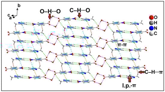 Figure 2 represents a 2D assembly of compound 1 along the crystallographic ac plane assisted by O–H∙∙∙O, C–H∙∙∙O, O–H∙∙∙N and non-covalent C–H∙∙∙C interactions. The water molecules (O3W and O4W) are involved in strong O–H∙∙∙O hydrogen bonding (HB) interactions with the carboxylate O-atom (O8A and O9A) of 4-NO2bz having O3W–H3WB∙∙∙O8A and O4W–H4WB∙∙∙O9A bond distances of 1.93 and 1.93 Å, respectively. C–H∙∙∙O HB interaction is also observed, involving the –CH moieties of 2-Mepy and O-atoms of 4-NO2bz having C3–H3∙∙∙O12A, C4–H4∙∙∙O11A and C5–H5∙∙∙O12A distances of 2.63, 2.61 and 2.59 Å, respectively. The coordinated water molecule (O1W) is involved in O–H∙∙∙N HB interactions with N1 atom of 2-Mepy having a O1W–H1WA∙∙∙N1 distance of 1.883 Å. Moreover, weak bifurcated C–H∙∙∙C interactions are also present in the crystal structure involving the methyl groups of 2-Mepy [C7–H7B∙∙∙C6 = 3.26 Å, C(sp3)–H∙∙∙C(sp2), C7∙∙∙C6 = 3.708 Å, C7–H7A∙∙∙C6 = 3.30 Å, C(sp3)–H∙∙∙C(sp2), C7∙∙∙C6 = 3.708 Å] [].