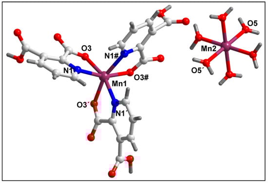 Manganese(II) chloride tetrahydrate, 2-methylpyridine, 4-nitrobenzoic acid, 2,3-pyridinedicarboxylic acid were bought from Sigma Aldrich (Darmstadt, Germany) and Merck (Darmstadt, Germany) and used without further purification. Elemental analyses of the compounds were recorded in a Perkin Elmer 2400 Series II CHNS/O analyzer (Waltham, MA, USA). A Bruker ALPHA II Infrared spectrophotometer (West Perth, WA, Australia) was used to record the FTIR spectra of the compounds. The electronic spectra of the compounds were recorded in a Shimadzu UV-2600 spectrophotometer (Duisburg, Germany). To record the UV-Vis-NIR spectra, BaSO4 was used as reference. A Sherwood Mark 1 Magnetic Susceptibility balance(Cambridge, UK) was used to calculate the magnetic susceptibility of the compounds. Thermogravimetric analyses of the compounds were performed in a Mettler Toledo TGA/DSC1 STARe system (Columbus, OH, USA) under the flow of N2 gas at a heating rate of 10 °C min−1.