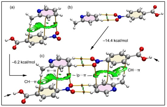 Interestingly, the QTAIM analysis ratifies the presence of the lp–π interaction involving one O-atom of the nitro group. It is characterized by a BCP and BP connecting the O-atom to one C-atom of the 2-Mepy ring. Finally, the QTAIM also confirms the importance of the C–H···π interactions, characterized by a BCP and BP connecting the H and C-atoms. All these interactions are also revealed by green-colored (attractive) RDG isosurfaces. Those characterizing the C–H···π and π–π interactions are quite extended, embracing most of the aromatic surfaces. We have evaluated the formation energy of the tetramer, starting from two different (2-Mepy)···(4-NO2bz) dimeric assemblies, in order to investigate the relative importance of the H-bonds with respect to the π-based interactions. The dimerization energy starting from the pre-formed π–π dimer (represented in Figure 7a) is –6.2 kcal/mol, which corresponds to the contribution of the four H-bonds (1.55 kcal/mol each H-bond). If the formation of the tetramer is computed starting from the H-bonded dimer (Figure 7b), the binding energy is significantly larger (–14.4 kcal/mol), thus suggesting that the combination of π–interactions (l.p-π, π-π and C–H···π) are energetically more relevant than the H-bonds.