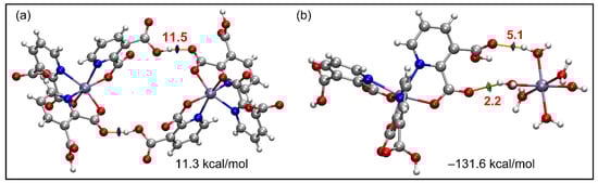 For compound 2, the theoretical study is focused on the analysis of the O–H···O H-bonds and π-stacking interactions, which have a significant structural directing role. The joint QTAIM and NCI plot analyses of two H-bonded dimers extracted from the solid state are provided in Figure 8. Each H-bond is characterized by a BCP, BP and dark-blue RDG isosurface connecting the H and O-atoms. The blue NCI Plot color discloses the strong nature of the H-bonds. However, the dimerization energy for the homodimer is positive (+11.3 kcal/mol) due to the electrostatic repulsion (anion···anion interaction) and absence of counterions in the model. Consequently, the contribution of the H-bonds was also estimated free from the pure Coulombic repulsion by using the value of the Lagrangian Kinetic energy density (Gr) measured at the bond CP and the equation proposed by Vener et al. (Edis = 0.429 × Gr) [] which was specifically developed for H-bonds in X-ray structures. The values are given in Figure 8 using a red font. The H-bonds are strong, with a dissociation energy of 11.5 kcal/mol each HB, in line with the dark blue color of the RDG isosurfaces. The total dissociation energy of the dimer is 22.6 kcal/mol. Figure 8b shows the QTAIM/NCI Plot analysis of the heterodimer, where the binding energy is very large (–131.6 kcal/mol) due to the strong Coulombic attraction between the counterions. The strength of the H-bonds has been also assessed using the Gr energy predictor to avoid the strong influence of electrostatic forces. In this case, the H-bonds are weaker than those of the homodimer, i.e., 2.2 and 5.1 kcal/mol, thus revealing that the H-bonds between the anionic units are stronger than those between the counterions.