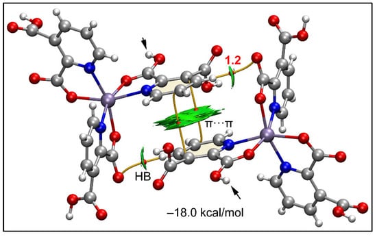 Finally, we have also analyzed the π-stacking interaction between the anionic moieties. In this case, to avoid the electrostatic repulsion, two carboxylate groups have been protonated (see small arrows in Figure 9). The π-stacking interaction is characterized by a large and green RDG isosurface and two BCPs and BPs interconnecting two carbon atoms of the rings. Such a large isosurface reveals a strong complementarity between the aromatic surfaces. The assembly is further stabilized by two symmetric C–H···O contacts established between the aromatic –CH groups and the O-atoms of the coordinated carboxylate groups. The strength of these H-bonds is modest (Edis = 1.2 kcal/mol each), thus revealing that the assembly is completely dominated by the π-stacking interactions, since the total binding energy is –18.0 kcal/mol). Such a large binding energy is related to the antiparallel orientation of the aromatic rings and their coordination of the metal centers, which increase the contribution of the dipole···dipole interactions.