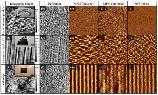 Figure 2 shows some examples of MFM frequency, amplitude and phase-signal images of a glass slide, a computer hard disk and a videotape. The glass is a non-magnetic material that serves as a reference material. As expected, only noise is observed in the MFM signals of the glass slide (Figure 2c–e). The MFM frequency, amplitude and phase images of the hard disk (Figure 2h–j) and videotape (Figure 2m–o) show magnetic features that are not related to the topographic height or any deflection of the sample surfaces (Figure 2f,g,k,l). The MFM scans of the hard disk and videotape show periodic magnetic domains, which is consistent with the literature [14,15]. The most sensitive rendition of the magnetic domain structure is achieved in MFM frequency images.