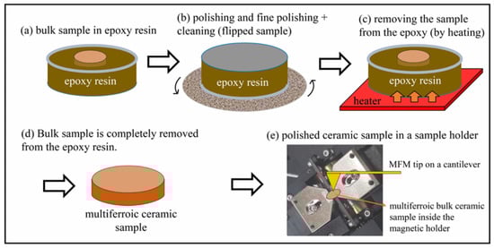 The ceramics are usually cut to the correct dimensions and polished to obtain a flat surface for the MFM examination. The procedure requires several steps. The first is embedding the ceramic sample in polymer resin, for example in epoxy resin (Figure 4a), and grinding with silicon-carbide abrasive papers (5–20 μm SiC particles). The second step is polishing the sample on a cloth with a polishing paste, gradually reducing the size of the diamond abrasive to 0.25 μm. The third step is fine polishing with a colloidal SiO2 suspension containing particles down to tens of nanometres (Figure 4b) [22]. The bulk sample is then removed from the epoxy resin by heating so that the epoxy resin softens and the sample can be removed (Figure 4c,d). The sample is then prepared for MFM measurements (Figure 4e). One option is also to coat the surface of the multiferroic sample with a gold layer a few tens of nanometres thick to eliminate the electrostatic interactions between the ferroelectric domains and the MFM tip [26].
