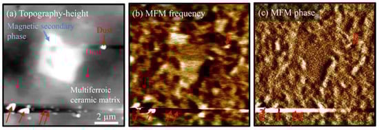 (a) AFM topography height and MFM (b) frequency and (c) phase images of a Bi0.88Gd0.12FeO3 multiferroic ceramic containing an Fe-rich secondary phase after polishing with a paste on a cloth and fine polishing with a colloidal SiO2 suspension. Some examples of dust particles on the sample surface are marked with red arrows.
