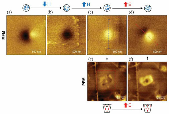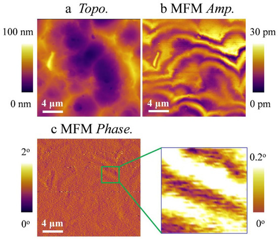 Figure 2, Figure 3, Figure 5, Figure 11 and Figure 12 were scanned using MFP-3D and Jupiter XR atomic force microscopes, Oxford Instruments, Asylum Research, Santa Barbara, CA, USA. For MFM scanning, the two-pass MFM technique and Si tips coated with CoCr (ASYMFMHM, AtomicForce F&E GmbH, Mannheim, Germany) and Fe (ASYMFMLC, AtomicForce F&E GmbH, Germany) were used. PFM imaging was performed in dual AC resonance tracking mode. A voltage of 5 V and a frequency of ~350 kHz were used. Pt-coated silicon tips with a radius of curvature of ~10 nm (OMCL-AC240TM-R3, Olympus, Tokyo, Japan) were used.