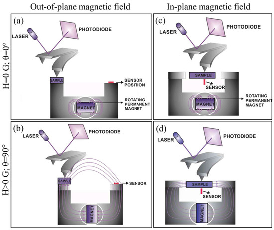 Atomic force microscopes can be equipped with options for applying external magnetic fields to specimens, including out-of-plane and in-plane magnetic fields. With this option, the magnetic domain structure of the materials can be studied inside or outside the external magnetic field. Such a setup is shown schematically in Figure 10, where the magnetic field applied to the sample depends on the rotation angle of the magnet. When the angle of rotation is zero, the magnetic flux is deflected away from the sample. When the magnet is rotated 90°, the magnetic flux is directed through the sample [14,41].
