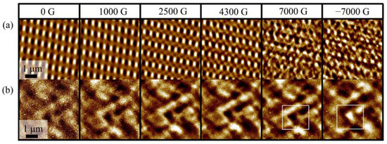 Figure 11 shows MFM frequency images of the computer hard disk and the Bi0.88Gd0.12FeO3 bulk ceramic. The images were acquired at in-plane external magnetic fields from 0 G to 7000 G and −7000 G. The ferromagnetic domain structure of the hard disk remains unchanged up to 4300 G, while at a higher external magnetic field of 7000 G, the ferromagnetic domains switch and become more irregularly shaped. In contrast, the magnetic domains of the Bi0.88Gd0.12FeO3 bulk ceramic do not switch, even at the highest magnetic field of 7000 G. When we change the polarity of the external magnetic field (from 7000 G to −7000 G), we can observe an interesting phenomenon. The MFM experiment on the Bi0.88Gd0.12FeO3 bulk ceramic (Figure 11b, compare 7000 G and −7000 G) shows a complete inversion of the MFM frequency signal, while the shape of the magnetic domain structure remains the same. This indicates, first, that the MFM signal is related to the magnetic interaction between the sample and the tip, and not to the topography cross-talk [14], and, second, that switching of the in-plane external magnetic field causes a change in the polarity of the tip rather than the movements of the ferromagnetic domain walls of the Bi0.88Gd0.12FeO3. The domain structure of Bi0.88Gd0.12FeO3 ceramics is stable due to the high coercive magnetic field of this sample [22].