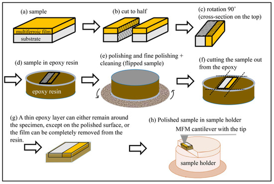 The second idea for future work in this area is to study multiferroic thick films by MFM in cross-section. The procedure for preparing the thick film specimen prior to MFM examination differs slightly from the procedure for preparing the ceramic specimen shown in Figure 4. Therefore, Figure 13 shows a schematic of this idea. The multiferroic films can be cut in half (Figure 13b,c), embedded in epoxy resin (Figure 13d), and polished in cross-section (Figure 13e). After polishing, the surfaces of the specimens should be cleaned, preferably with distilled water, and dried in air. The specimens are removed from the cast by cutting away the epoxy resin around the films (Figure 13f,g). The specimen is placed in a specimen holder with a polished cross-sectional surface on top (Figure 13h). In the last step, MFM scanning should be performed on the cross-sectional surface. Using a PFM mode, a similar experiment was performed for ferroelectric thick films, where the ferroelectric properties of 0.65Pb(Mg1/3Nb2/3)O3–0.35PbTiO3 thick films in cross-section were investigated [45].