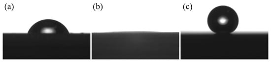 The contact angles of the three surfaces: (a) the original sample, (b) the LT sample, (c) LT and HT samples.