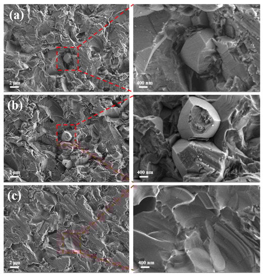 Figure 3 shows SEM images of the three surfaces. Figure 3a shows the original SiC surface after grinding, with a relatively rough surface and extensive distribution of grooves. Additionally, from Figure 3a–c, it is clear that both LT and LT and HT samples reserve most of the grain boundary and grooves from the original. However, Figure 3b is the LT surface with obvious traces of laser action, which has removed the capture of free organic matter from the original surface and presents a superhydrophilic (SHPi) state. It shows the micron-sized bump structure on the LT surface, with several small nanoscale particles adhering to the top of the bump. The LT surface has less nano-burr structure, and the droplet has a large contact area with the surface, so the surface shows SHPi. Figure 3c shows the nanoscale sheet-like protrusion structure on the LT and HT surfaces. After heat treatment, the small nanoparticles attached to the tabs grew sufficiently to form protrusions. As the droplet had a small contact area with the surface, the LT and HT surface shows SHPo. When the droplet came in contact with the surface, it gradually filled the entire nano groove. If the driving force of the droplet exceeded the hysteresis resistance, the bottom radius of the droplet began to contract. Among them, the nanostructure of the LT and HT surface formed multiple air pockets in contact with air. When the bottom radius shrank to a certain extent, the percentage of contact area between the droplets and the surface decreased, and most of the droplets were lifted by this air film. This indicated that the nanostructure of the LT and HT surface could effectively capture air, reduce the contact area between droplets and the surface, and play a decisive role in the generation of superhydrophobicity.