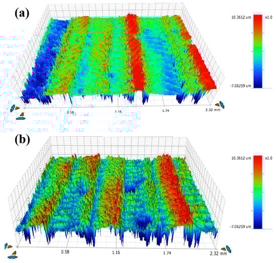 The three-dimensional surface profile of the samples: (a) LT sample; (b) LT and HT sample.