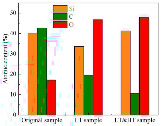 Figure 5 shows the atomic content of the samples. The percentage of oxygen elements on the original surface, the LT surface, and the LT and HT surface are 17.07%, 46.79%, and 48.04%, respectively. Meanwhile, the percentage of elemental carbon on the original surface, the LT surface, and the LT and HT surface are 42.72%, 19.53%, and 10.71%, respectively. During the laser texturing process, the SiC surface reacted with oxygen to form SiO2, and the free organic matter adsorbed on the original surface was removed. After the SiC samples were baked at high temperatures, some SiO on the SiC surface continued to oxidize to SiO2, and therefore the oxygen content increased.