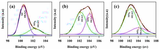 Figure 6 shows the XPS characteristic spectral lines of the three surfaces. Figure 6a–c shows the XPS analysis of three different SiC surfaces. According to the Si2p spectrum of SiC samples, it can be known that the peaks of 100.5 eV, 102.2 eV, and 104.1 eV belong to SiC, SiOX, and SiO2, respectively. The SiC content and SiOX content of the original surface are 97.3 wt.% and 2.7 wt.%, respectively. The SiC interface reacted with the surroundings during LT, and the SiC content is not obvious. The contents of SiOX and SiO2 on the surface are 34.51 wt.% and 65.49 wt.%, respectively. The possible reaction [24,25,26,27] was: 2SiC + 2O2→SiOX (s) + SiO2 + CO. At the same time, the surface-captured free organic matter was removed, and SiO2 surface energy was relatively high, so the surface was in a SHPi state. After LT and HT, SiC content was not obvious, SiOX content increased to 69.76 wt.%, and SiO2 content was 30.24 wt.%. During heat treatment, the nano-groove structure was formed, and the low surface energy SiOX produced on the surface, the surface became SHPo.