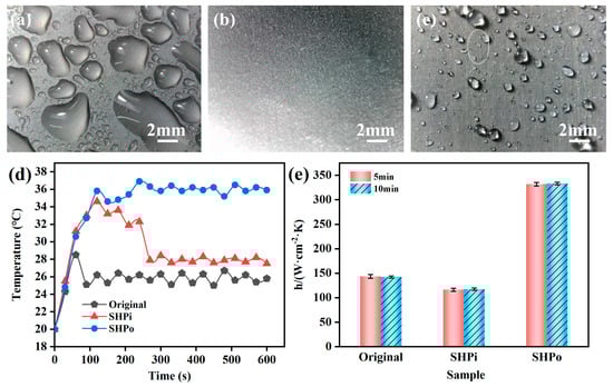 As seen in Figure 7d, during the 120 s condensation test, the SHPo and SHPi surface temperatures steadily increased with the same rising trend. During the 120 s–600 s condensation process, the SHPo surface temperature reaches a maximum value (about 36 °C) and then tends to stabilize, while the SHPi surface temperature reaches a maximum value and then suddenly drops to a certain temperature value (about 28 °C). The original surface temperature reaches a stable value (about 26 °C) around 80 s and remains stable. After 10 min of testing, the SHPo SiC surface temperature was the highest, the original was the lowest, and the SHPi one was in the middle. At the beginning of the test, the temperature of the three surfaces gradually increased, and the rising trend was consistent. After that, the temperature of the SHPo surface reached the maximum value and then stabilized; the original soon remained stable. The SHPi surface, on the other hand, decreased and remained stable after reaching its maximum value. The droplets did not completely fill the grooves at the beginning of the experiment. As the condensation proceeded, the surface was gradually wetted by droplets, and the condensation form gradually changed to filmwise condensation; thus, its surface temperature dropped abruptly. The droplets condensed rapidly on the SHPo surface, and when the droplets grew and merged to reach the droplet shedding diameter, the droplets would fall off from the SiC surface under the action of gravity. At the same time, the small droplets that were still nucleated would be detached together. These new condensation areas provided more areas for vapor condensation on the surface, thus making the mass of condensing droplets increase per unit of time, and the condensation heat transfer efficiency was high. As the condensation of steam continues, the droplets inside the grooves between the micro-nano structures will slowly increase, and their surface tension will adsorb the condensate droplets on the raised structures, and the condensate droplets will gradually fill the grooves, thus forming a liquid film on the condensing surface. As the condensate increases, the liquid film will gradually thicken, organizing the droplets from the gaseous state to the liquid state, making the condensation form into filmwise condensation, and the heat transfer efficiency decreases significantly.