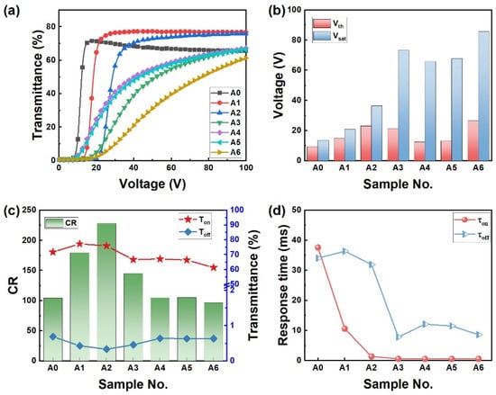 Electro-optical performances of sample series A. (a) voltage–transmittance curves; (b) driving voltages Vth and Vsat; (c) contrast ratio (CR) and the maximum and minimum transmittance values (Ton and Toff); (d) response times ton and toff.