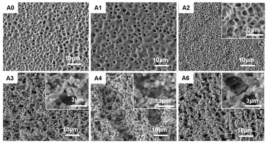 Subsequently, the SEM morphology of the polymer matrix was examined and the resulting images are displayed in Figure 3. Generally, two types of polymer morphology can be found: the typical porous matrix in samples A0~A2 and the coarse polymer-microsphere type polymer in samples A3~A6, which verifies the guess from the electro-optical property evaluation. As shown in Figure 3 (A0~A2), the void size that represents the liquid crystal droplet size reduces with the content of HPMA in samples A0~A2, corresponding to the increased driving voltages and decreased Toff value, as in Figure 2. Further improving the concentration of HPMA in samples A3~A6 results in polymer-microsphere type morphology instead of the typical Swiss-cheese type. Some semi-hidden polymer microspheres grow on the surfaces of the polymer network and liquid crystal fills the crevices. It seems that both the polymer phase and the liquid crystal phase are continuous. Possible explanations for the formation of polymer microspheres could be given according to the competition between polymerization and phase separation. It is suggested that the hydrogen atom is easily drawn by the primary free radicals and thereby an alkoxy free radical is produced [33,35,38]. Therefore, the introduction of the hydroxy group could elevate the initiation efficiency of the photoinitiator and speed up the polymerization. On the other hand, the hydroxy group is hydrophilic while the other monomers and liquid crystals are hydrophobic. Hence, the polymer produced at the early stage contains the hydroxy group and tends to phase separate to further develop into a microsphere shape. At the same time, the subsequent polymerization process connects them to form a three-dimensional network. According to the plots in Figure 2, the polymer-microsphere structure in samples A3~A6 could not optimize the electro-optical performance of PDLCs.