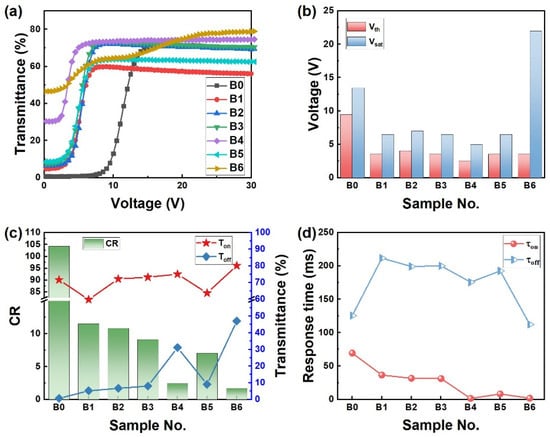 Electro-optical performances of sample series B. (a) voltage–transmittance curves; (b) driving voltages Vth and Vsat; (c) contrast ratio (CR) and the maximum and minimum transmittance values (Ton and Toff); (d) response times ton and toff.