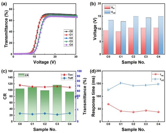 Electro-optical performances of sample series C. (a) voltage–transmittance curves; (b) driving voltages Vth and Vsat; (c) contrast ratio (CR) and the maximum and minimum transmittance values (Ton and Toff); (d) response times ton and toff.