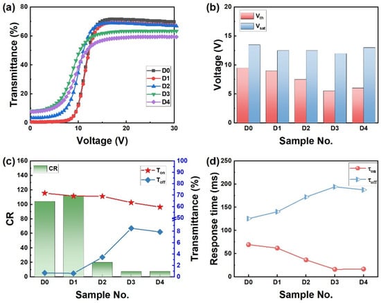 Electro-optical performances of sample series D. (a) voltage–transmittance curves; (b) driving voltages Vth and Vsat; (c) contrast ratio (CR) and the maximum and minimum transmittance values (Ton and Toff); (d) response times ton and toff.