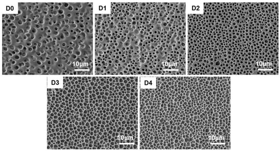 Correspondingly, the SEM morphology of the polymer matrices in sample series D shows a similar trend, as displayed in Figure 9. When the concentration of 8OCB increases, both the density and size of voids increase. Consequently, the distance between two nearby voids reduces and the polymer between voids becomes thinner.