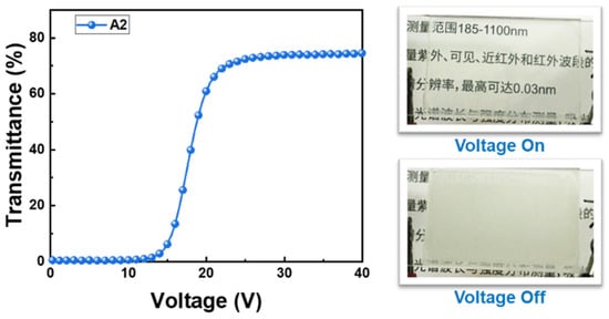 (left) voltage–transmittance curves; (right) the transparent on-state and opaque off-state photos of PDLC sample A2. The background letters are written in Chinese characters and they are displayed as a picture with no meaning.