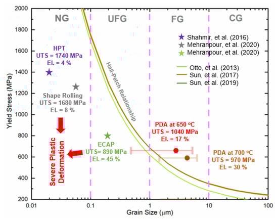 - Wu, X.L.; Yang, M.X.; Yuan, F.P.; Wu, G.L.; Wei, Y.J.; Huang, X.X.; Zhu, Y.T. Heterogeneous lamella structure unites ultrafine-grain strength with coarse-grain ductility. Proc. Natl. Acad. Sci. USA 2015, 112, 14501–14505. [Google Scholar] [CrossRef]
