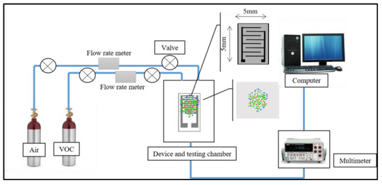 Figure 2 shows the diagram of the development of the thin film on IDE and the construction of the gas sensor. A volume 1.0 μL was developed on the IDE using the drop casting method. The thin film was then dried at room temperature. For the measurement setup, the IDE chamber was connected to the outlet tube of the air and VOC and the multimeter.