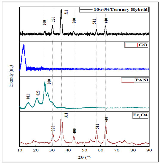 The ternary hybrid nanocomposite was prepared by an in-situ method, as shown in Figure 1, where the as-synthesized Fe3O4 and PANI were first sonicated in a bath for 30 min. Then both solvents were added and mixed with the GO paste for another 1 h to ensure homogeneity. Then, 0.1 g ascorbic acid was added to the mixture and heated to 90 °C for 2 h. Finally, the product was centrifuged and washed with ethanol and water. The dry product was obtained by drying the mixture in an oven. The synthesis process is illustrated in Figure 1. Five different samples were synthesized with different weight ratios of the materials. The name and description of the samples are listed in Table 1.
