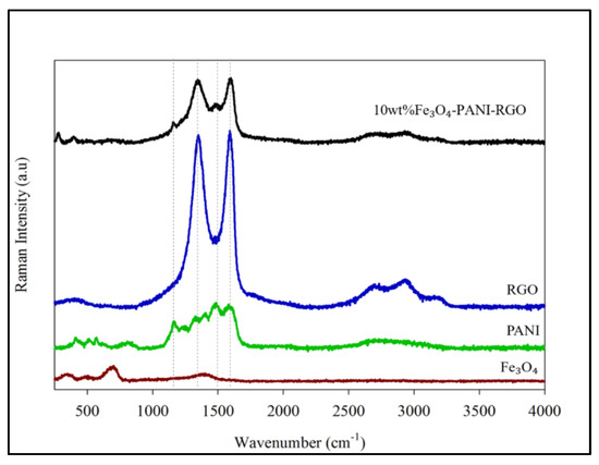 Raman spectroscopic analysis was performed to verify the presence of PANI and RGO. Figure 4 shows two observation peaks at 1345 cm−1 and 1594 cm−1 for the ternary hybrid material sample, indicating the D and G bands of GO. While the G band correlates to the sp2-hybridized graphitic carbon atoms in RGO, the D band is related to structural defects and disorder of RGO [36,37]. When comparing the single constituents of RGO with sample S1_10, it was found that the ID/IG decreased from 0.975 to 0.969, which is related to the reduction of the defect following the PANI coating [38]. Two other small peaks from sample S1_10 can be seen at 1157 and 1484 cm−1, which represent the C-H vibration in the quinoid and semiquinone structures of PANI and show the establishment of a PANI chain on GO for the ternary hybrid nanocomposite material [39].