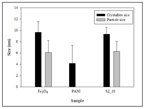 where is the particle size (nm), is a constant ( = 0.94), is the x-ray wavelength, is the full width at half maximum (FWHM) of the diffraction peak, and is the angle of diffraction. The crystallite size calculated from (Equation (5)) for the samples Fe3O4, PANI and S2_10 were 9.68 ± 1.9, 4.17 ± 3.2 and 9.34 ± 1.4 nm, respectively.