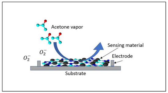 Figure 8 shows the schematic diagram of the sensor mechanism. When the metal oxide sensor is placed in an environment with the presence of target gas, the target gas will react with the oxygen species on the surface of the active material (Equations (1)–(4)). The interaction between the target gas and the oxygen species will create a resistance change in the sensor. For acetone, the reaction is simplified as follows [43]: