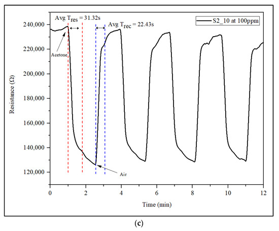 Figure 9a–c show the response and recovery time for all samples when expose to 1, 10, and 100 ppm acetone, respectively, while Figure 10a–c show the real-time response of samples S2_10 when expose to 1, 10, and 100 ppm acetone, respectively. The response time is defined as the time from the first contact of the sensor with acetone vapor, in which the sensor resistance reaches 90% of the saturated value of the resistance to acetone vapor. The recovery time is the time from which the acetone resistance returns to 10% of the baseline [44]. To imitate the most common environment for the gas sensor, air was used as the carrier gas.