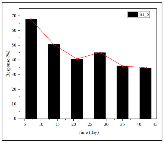 where Rg is the electrical resistance in the presence of gas, and Ra is the electrical resistance in the presence of air. The sensor response shown in Figure 11 for sample S2_10 was observed for 42 days. It shows that the response does not vary significantly. This is due to some factors, such as the ability of the analyte molecules to be adsorbed on the surface of the active materials due to the pore volume [48]. This can be explained by the SEM image in Figure 5e, where the pore volume of sample S2_10 can be obviously seen on the surface of the sample. Therefore, the improvement of the pore volume has a great influence on the sensitivity of the sample [49].