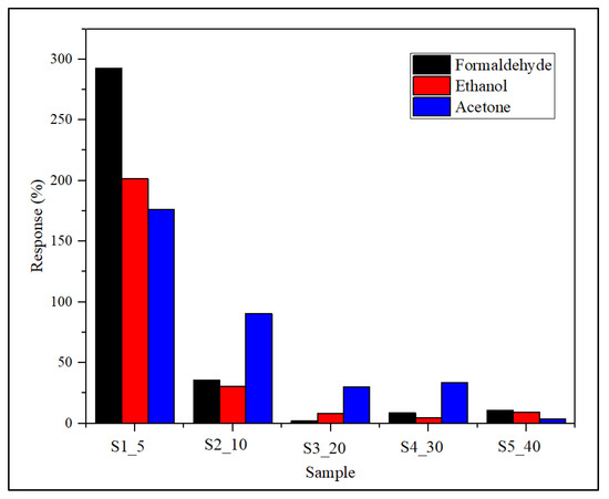 Figure 12 shows the sensory response of all samples when exposed to 1000 ppm formaldehyde, ethanol and acetone. It can be seen that sample S1_5 reacts more strongly to formaldehyde, while samples S2_10, S3_20 and S4_30 react three times more strongly to acetone compared to formaldehyde and ethanol. From this, we can conclude that sample S2_10 has a high response to acetone and is suitable for breath analyzers for pre-diabetic diagnosis.
