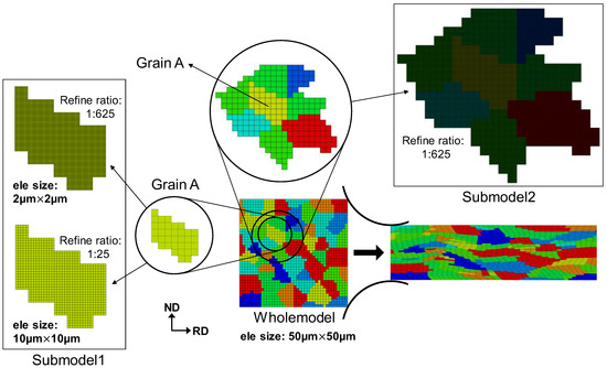 The simulation, following the experimental conditions and procedure, was carried out using the commercial FE package Abaqus/Standard ver.6.9. A two-dimensional FE model under plain-strain conditions was developed. The rolls (125 mm in diameter) were modelled as analytical rigid bodies. The element type is CPE4R, four-node elements with a reduced integration point. A polycrystal model with a coarse mesh (element size: 50 µm 50 µm), i.e., Wholemodel, was developed, as shown in Figure 2. After the Wholemodel, a feature region, Grain A in Figure 2, was reconstructed in the Submodel-1 and was then finely meshed with refinement ratios of 1:25 and 1:625. In the former and latter cases, one Wholemodel element was divided into 25 elements (element size: 10 µm 10 µm) and 625 elements (element size: 2 µm 2 µm), respectively. The element size of 2 µm 2 µm in the Submodel-1 is comparably large as the step size used in EBSD scans. In the Submodel-2 (Figure 2), not only Grain A but also its neighbouring grains were included. Grain A in the Submodel-2 was driven by the neighbouring grains, which are supposed to apply relatively ‘soft’ boundary conditions on Grain A. When Submodelling, the initial grain orientations in both the Wholemodel and Submodel were kept the same.