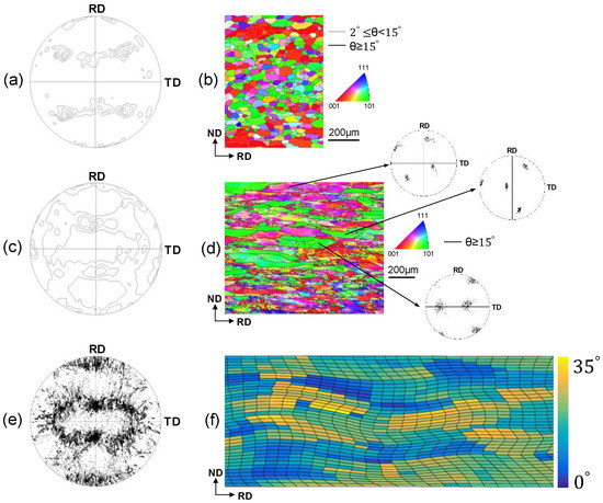 Figure 3a,b show a (1 1 1) pole figure and EBSD map of the starting material, respectively. The initial texture is a recrystallized texture, i.e., [5] <0 0 1> Cube dominated (Figure 3a), and only a small number of low-angle grain boundaries (LAGBs) (2° < ) in grains can be seen (Figure 3b). After rolling, the global texture evolved into a rolling texture (Figure 3c), typically consisting of {1 1 2}<1 1 1>, {1 2 3}<6 3 4> and {1 1 0}<1 1 2>. The high-angle grain boundaries (HAGBs) in Figure 3d are believed to be from the original ones but did not evolve during rolling, and the subgrain and LAGBs formed within the initially annealed grains. The pole figures of three representative grains are shown on the right of Figure 3d, from which it can be seen that an in-grain subdivision occurred and initially uniform in-grain orientations became scattered.
