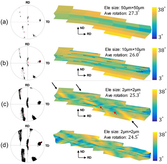 The texture evolution of Grain A in the Wholemodel is shown in Figure 4a, and only a few elements were used to describe the in-grain texture; thus, the texture gradient is very high. As for the Submodel-1, a similar texture of Grain A was reproduced with the refinement ratio of 1:25 (Figure 4b), where the intensities of major texture components were strengthened and subtle components were also captured. The texture prediction was further improved by increasing the refinement ratio to 1:625 (Figure 4c), and macroscopic shear bands (marked by black arrows) and microscopic shear bands (red arrows) were also predicted. The predictions in the Submodel-2 1:625 (Figure 4d) are similar to those in Figure 4c in terms of shear bands and strong and weak texture components, although the grain shape is slightly different, since Grain A in the Submodel-2 was driven by the neighbouring grains, but not directly by its deformation history in the Wholemodel. The crystal rotation angles in the four models (shown in Figure 4) are similarly distributed in Figure 5. Although the fraction of relatively large rotation angles decreases slightly as the mesh resolution increases, the distributions of all four models are generally consistent. This agrees with the slightly lowered average rotation angles of Grain A in the four models (Figure 4).