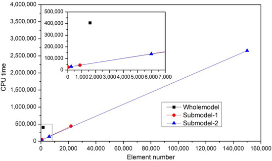 Figure 6 shows the CPU time at different refinement ratios. It can be seen that the computation time of the Wholemodel was reduced by about ~85% in the Submodel when the element number in them is the same. This is because complicated boundary conditions and interactions were considered when analysing the Wholemodel, and they cost expensive computation sources, while the boundary conditions for the Submodel are greatly simplified and thus the computation time is reduced. As for the Submodel with different mesh refinement ratios, it can be seen that the CPU time is almost linearly related to the element number. The CPU time increases ~17 times when the mesh refinement ratio is 625. When using the Submodel method, the computation time became affordable, especially for a relatively small region.